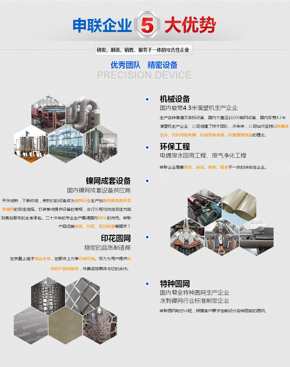 申聯企業是一家集機械設備、環(huán)保工程、鎳網生產成套設備、印染鎳網、特種鎳網等系列相關產品的研發(fā)、制造、銷售、售后服務于一體的綜合性企業。企業屬下有宜興申聯機械制造有限公司和宜興市申聯環(huán)保紡織器材廠有限公司。